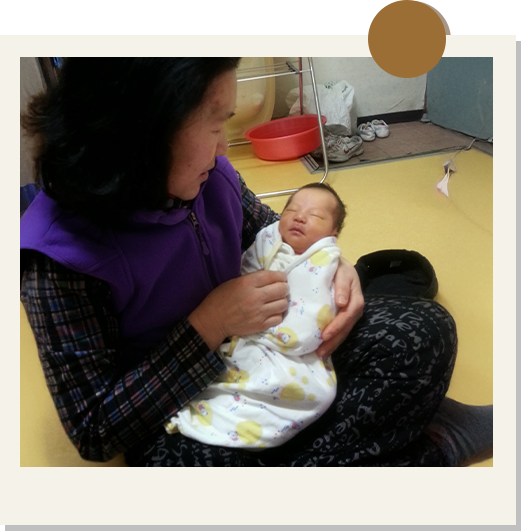 아직 눈도 뜨지 못한 어린 손녀를 품에 안은 할머니.